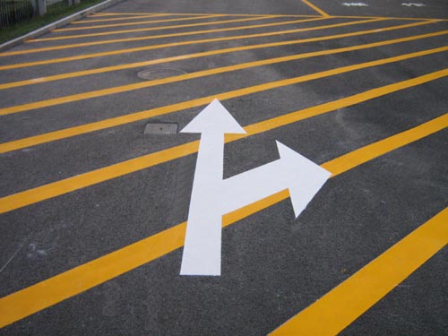 沥青马路经常标划着各种白色或黄色等颜色的标线,这种道路划线的作用分为指示、禁止和警告,通过各种线条、箭头或者文字等标示的组合,对路过行人或车辆进行管制和引导,达到安全出行的目的。
